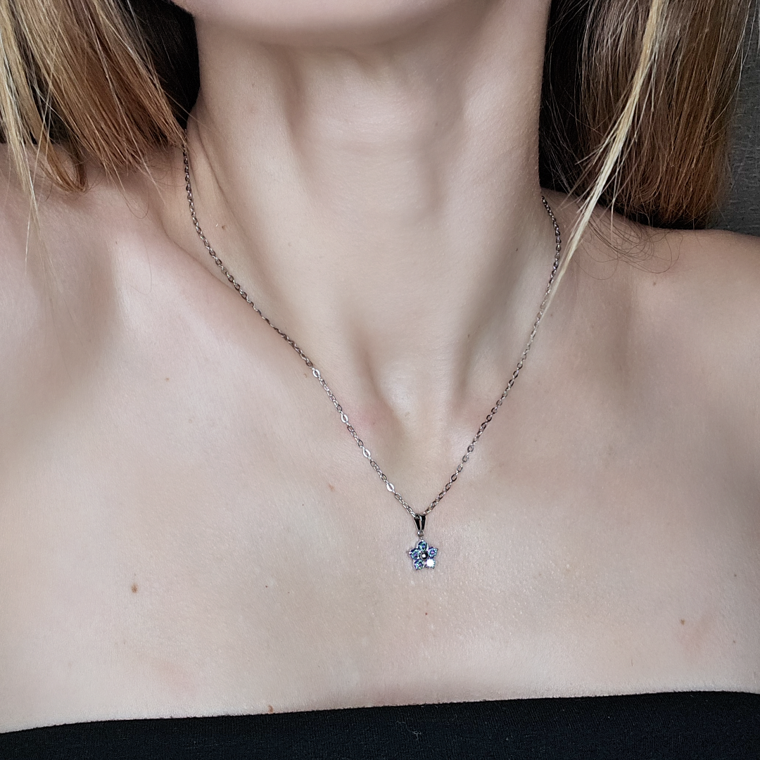 Colier elegant 46 + 5 cm, din oțel inoxidabil, cu pandantiv floral 0.8 x 0.8 cm înfrumusețat cu zirconiu cubic. Închidere tip lobster claw, confortabilă și sigură.